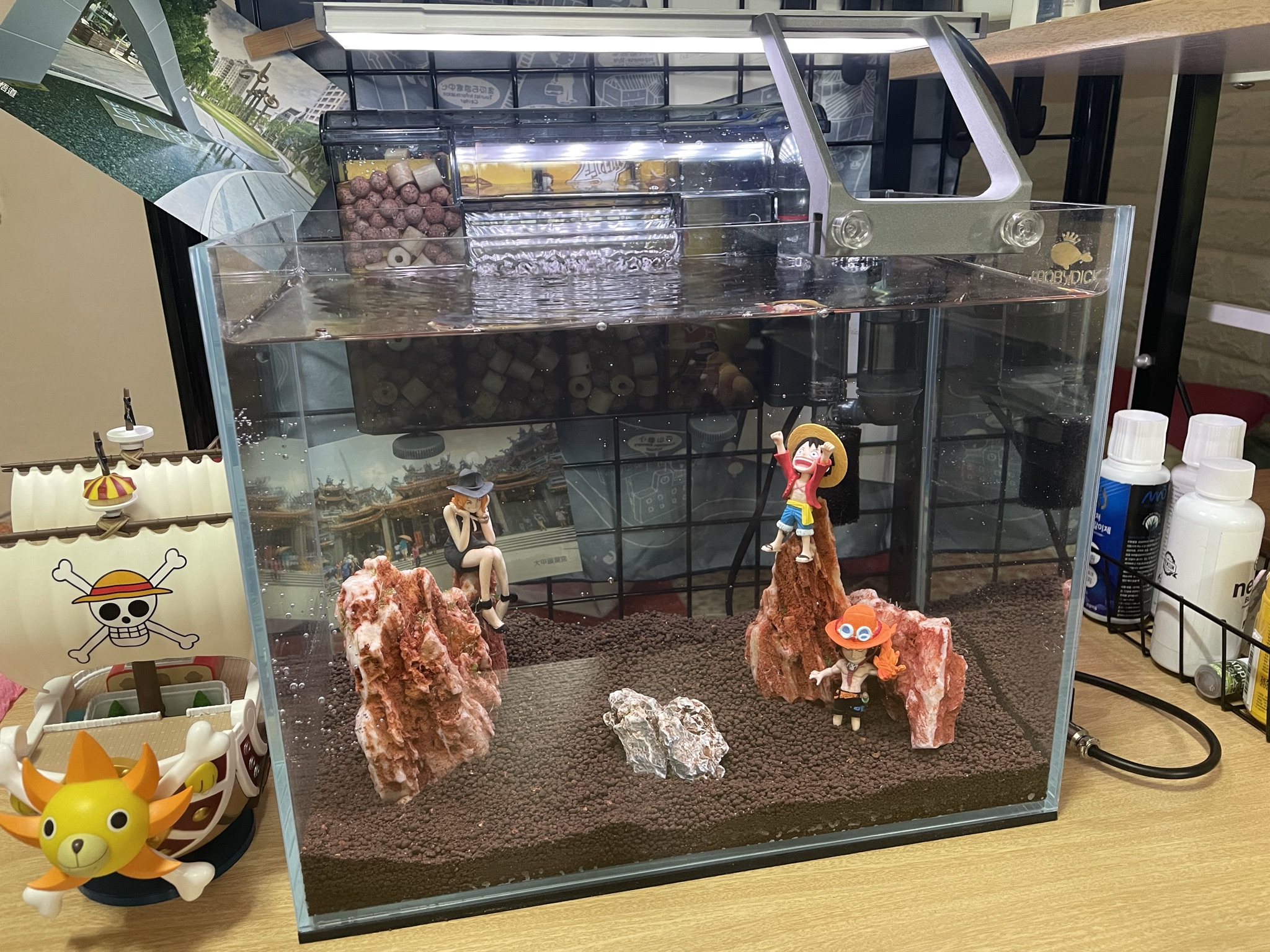그리고 어항을 꾸밀 재료를 배치하였다. 기존의 배치가 내 생각에 나쁜편이 아니라고 생각했다. 그게 변하지 않는 선에서 샹크스를 빼고 가운데 시야를 확보하기 위해 돌을 양쪽으로 배치했다.